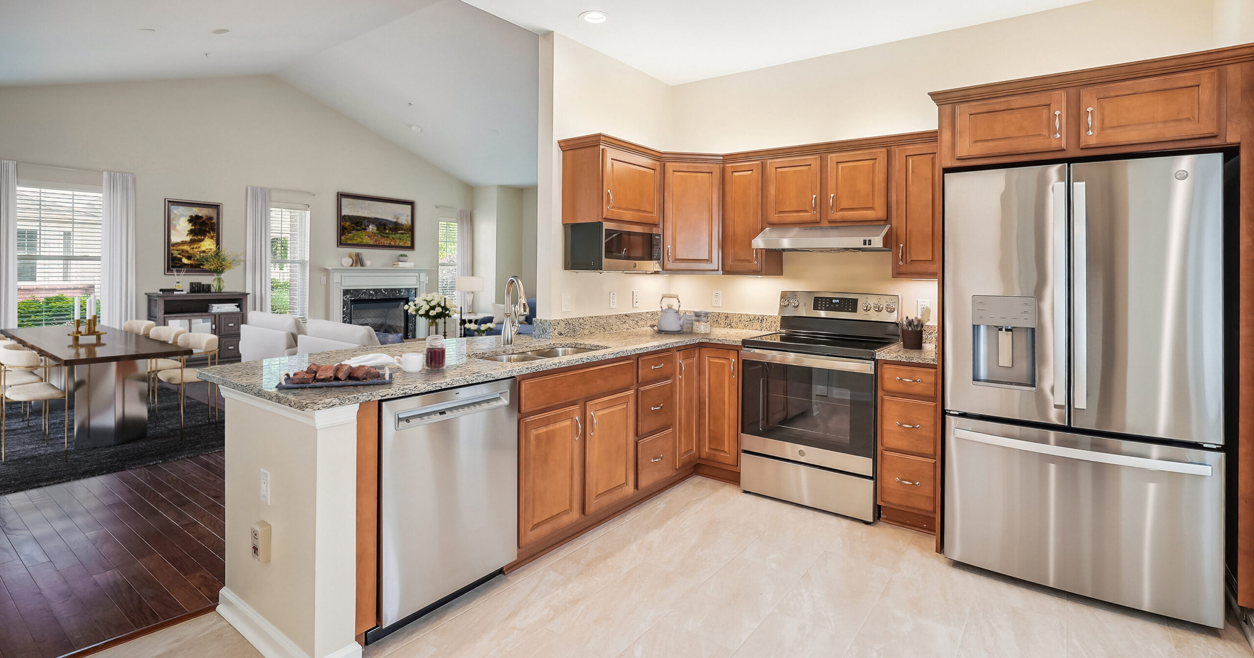 • Kitchens with a sink, refrigerator, microwave and dishwasher